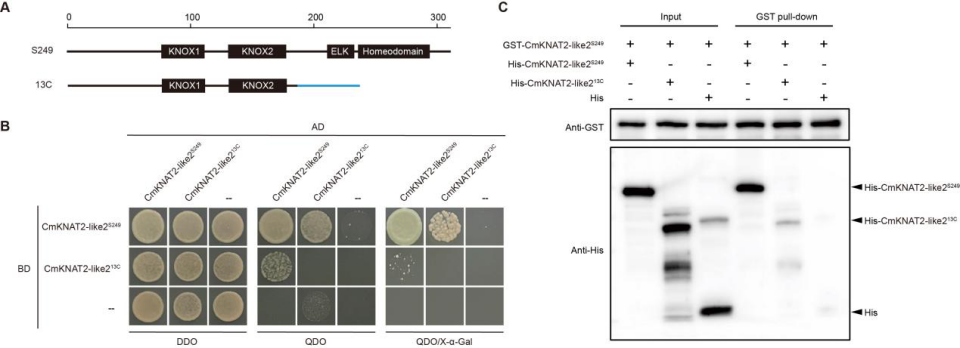 进一步分析发现,TIR转座子的插入导致CmKNAT2-like2编码蛋白缺少了ELK和Homeodomain两个保守结构域。亚细胞定位、酵母双杂交及pull-down实验表明,以上两个结构域的缺失影响了蛋白的核定位及自身形成二聚体的能力。转录组分析表明,CmKNAT2-like2的功能失活破坏了果皮叶绿体的发育,并改变了与叶绿素生物合成相关基因的表达。群体分析进一步表明CmKNAT2-like2基因内的转座子插入的经历了广泛的自然选择,并且与甜瓜的果皮覆纹显著相关。