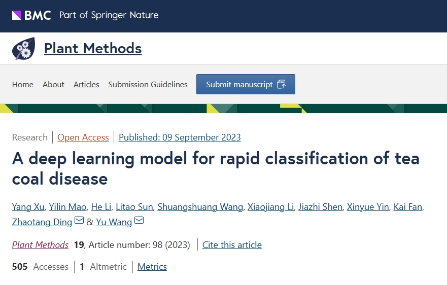 2023年8月27日,茶树育种团队在Plant Methods 发表了题为“A deep learning model for rapid classification of tea coal disease”的研究论文。allwincity万象城官方网站正高级实验师王玉为论文共同通讯作者,allwincity万象城官方网站茶学专业在读硕士研究生徐阳为第一作者。该研究得到了山东省茶产业技术体系首席专家项目、山东省农业良种工程项目、山东省农业科学院创新项目和山东省泰山学者专项基金等的资助。