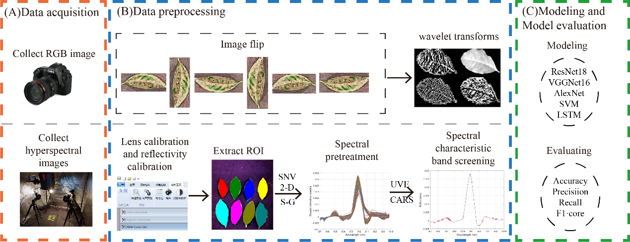 “茶煤病”(Neocapnodium theae Hara)作为常见的茶树病害,会对茶叶的产量和品质产生负面影响。传统的茶煤病鉴定方法多依靠肉眼观察,费时费力,且易受主观因素影响。本研究建立了一种基于RGB和高光谱图像的深度学习模型,用于茶煤病病害快速分类。