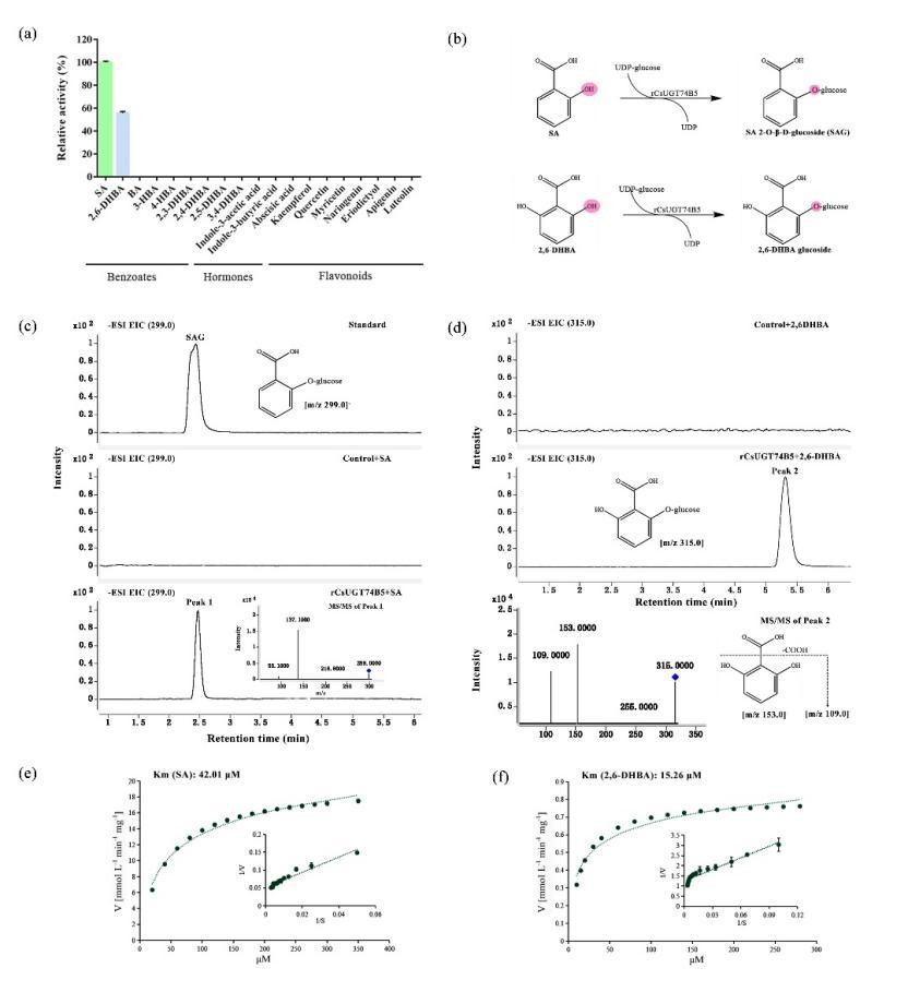 课题组研究发现茶树感染炭疽病后叶片中游离态SA含量显著积累,同时发现一条糖基转移酶CsUGT74B5的表达量显著下调。系统进化分析表明CsUGT74B5可能具有催化苯甲酸类衍生物的功能。通过体外原核表达和酶学手段,并借助蛋白晶体预测、分子对接技术,我们证明了CsUGT74B5具有催化苯甲酸衍生物邻位羟基糖苷化的功能,CsUGT74B5在体外可催化SA和2, 6-DHBA两种底物生成对应的糖苷。借助异源植物遗传转化和茶树瞬时过表达等技术,我们发现CsUGT74B5在植物体内同样可催化SA糖苷化形成SAG。在茶树瞬时过表达CsUGT74B5后,我们发现叶片中游离态SA的含量显著下降,增加了茶树对炭疽病的敏感性。