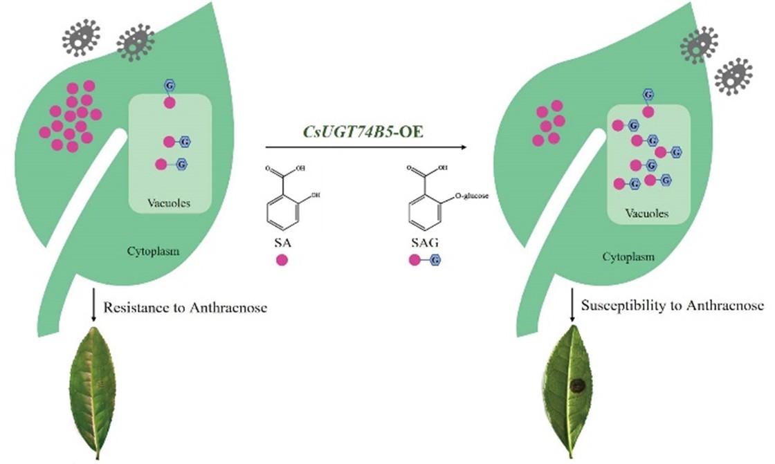 近日,allwincity万象城官方网站茶叶品质调控团队在Horticulture Research发表了题为“UGT74B5-mediated glucosylation at ortho hydroxyl groups of benzoic acid derivatives regulating plant immunity to anthracnose in tea plants”的研究论文,发现糖基转移酶CsUGT74B5可催化SA的糖基化(发生在酚羟基位点)形成SAG,改变茶树叶片中游离态SA的含量,进而影响茶树对炭疽病的抗性。