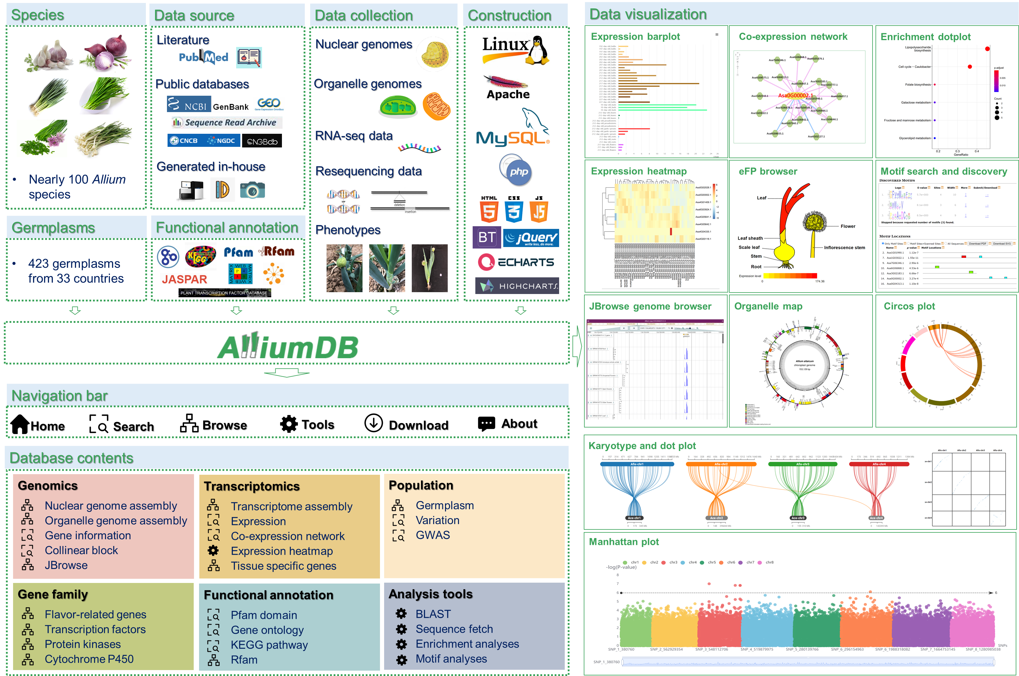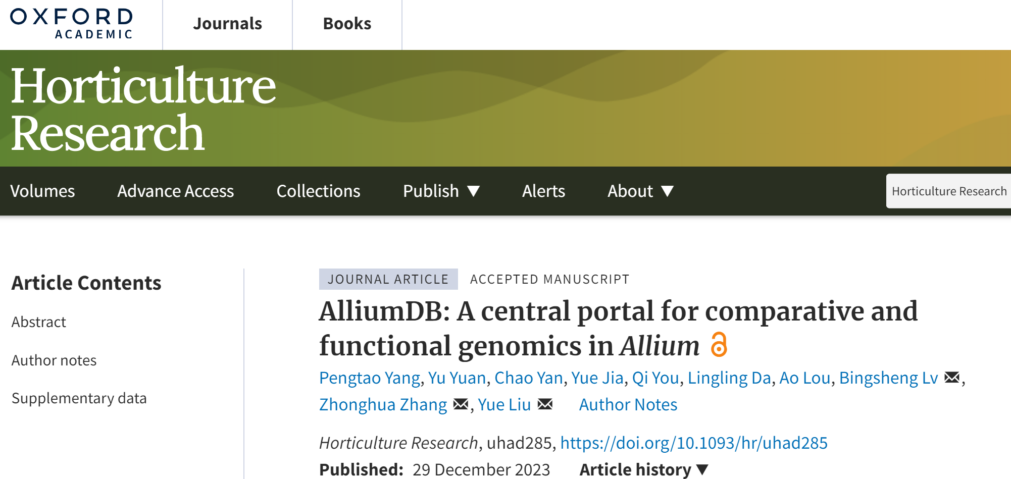 近日,allwincity万象城官方网站大葱分子设计育种创新团队在国际著名期刊Horticulture Research发表题为 AlliumDB: A central portal for comparative and functional genomics in Allium的研究论文。该研究通过整合葱属多个物种的基因组、转录组、变异组、表型组等数据,构建了一个葱属比较基因组学和功能基因组学数据库,为葱属作物遗传育种研究提供了重要的数据资源和分析平台。