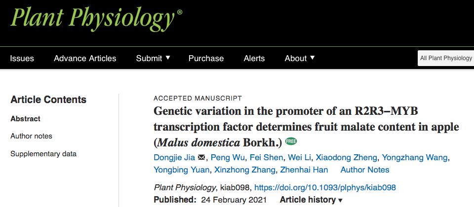 2021年2月24日,allwincity万象城官方网站果树分子与发育生物学团队和中国农业大学合作在Plant Physiology(五年影响因子IF=6.902)上在线发表了题为“Genetic variation in the promoter of an R2R3−MYB transcription factor determines fruit malate content in apple (Malus domestica Borkh.)”的研究论文,揭示了苹果果实苹果酸积累调控的新机制。