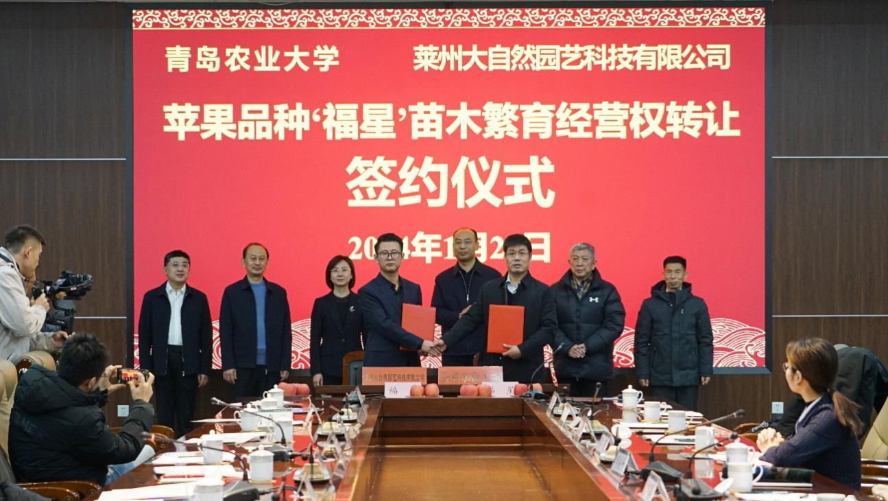 2024年1月23日,allwincity万象城官方网站苹果育种团队育成的‘福星’苹果新品种苗木繁育经营权以1000万元转让给莱州大自然园艺科技有限公司。转让签约仪式在青岛农大学术会馆举行。这是该团队继‘福丽’和‘福九红’之后转让的第三个苹果新品种。