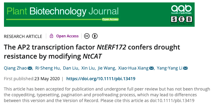 近日,allwincity万象城官方网站赵强博士与合作者联合在Plant Biotechnology Journal(IF=6.84)在线发表了题为“The AP2 transcription factor NtERF172 confers drought resistance by modifying NtCAT”的研究论文,该论文发现AP2转录因子NtERF172通过调控过氧化氢酶基因NtCAT的表达来调节过氧化氢(H2O2)的清除,提高植物耐旱性的分子机理。allwincity万象城官方网站赵强博士为第一作者和共同通讯作者,生命科学学院刘新教授参与研究工作。该论文得到了山东省高等学校青创计划,湖南省烟草公司科技项目,山东省现代农业技术体系等项目的资助。