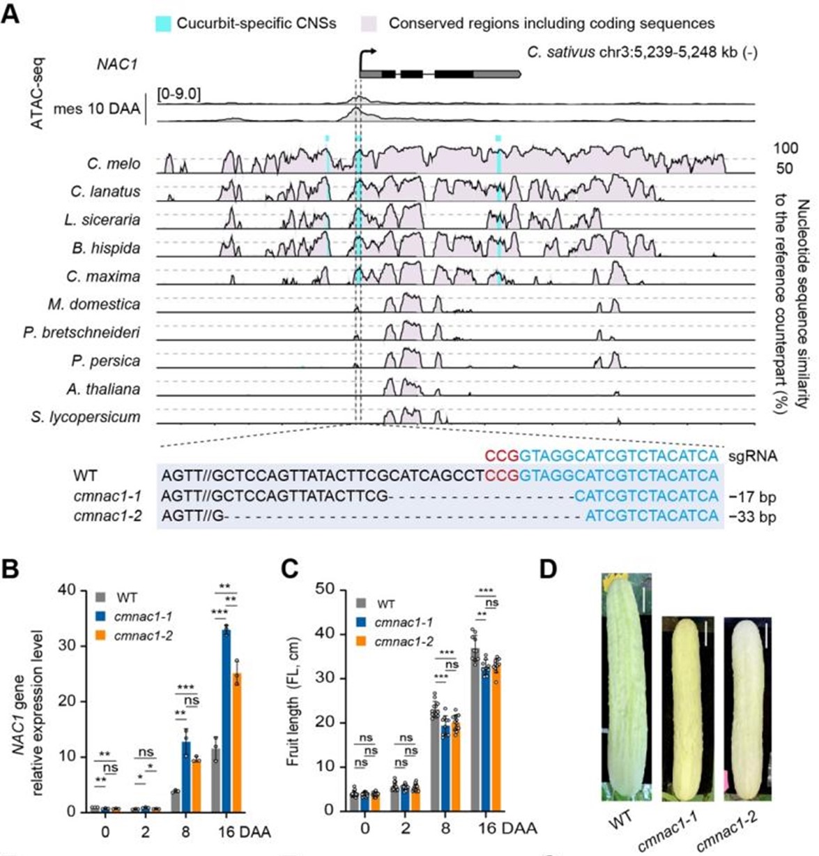 在1687个葫芦科特异性的保守调控元件中,随机选择了2个在黄瓜中进行了CRISPR基因编辑突变,发现两个突变都导致果实形状的明显改变,并且分别调控了附近NAC1和EXT-like基因的表达模式改变,证实了发现的保守调控元件可调控葫芦科物种的果实发育(图2)。此外,NAC1基因已知是控制果实成熟的明星转录因子基因,该实验第一次发现还可以控制果实发育,为该基因的新功能提供了证据。