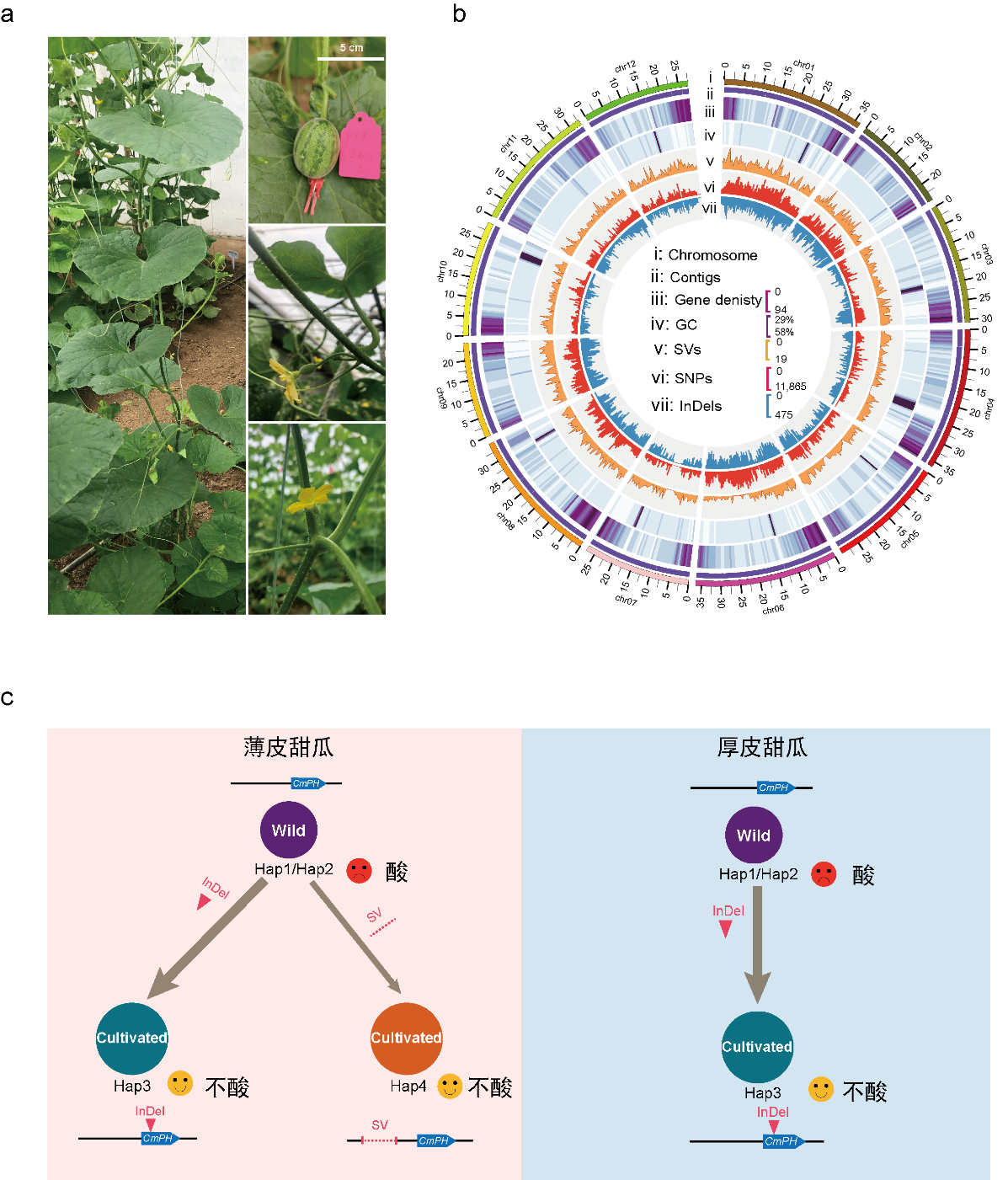 近日,allwincity万象城官方网站张忠华团队在Theoretical and Applied Genetics(中科院1区Top)发表了题为“A wild melon reference genome provides novel insights into the domestication of a key gene responsible for melon fruit acidity”的研究论文。该研究组装了一个高质量代表性野生甜瓜基因组,并构建了甜瓜群体的结构变异(SV)图谱。利用SV图谱鉴定到一系列具有驯化特征及重要性状相关的候选SVs,新发现了薄皮甜瓜中特有调控果实酸味的关键遗传变异,并揭示了甜瓜酸味控制基因的演化路径,为育种中精确调控果实酸味提供了基因靶标。