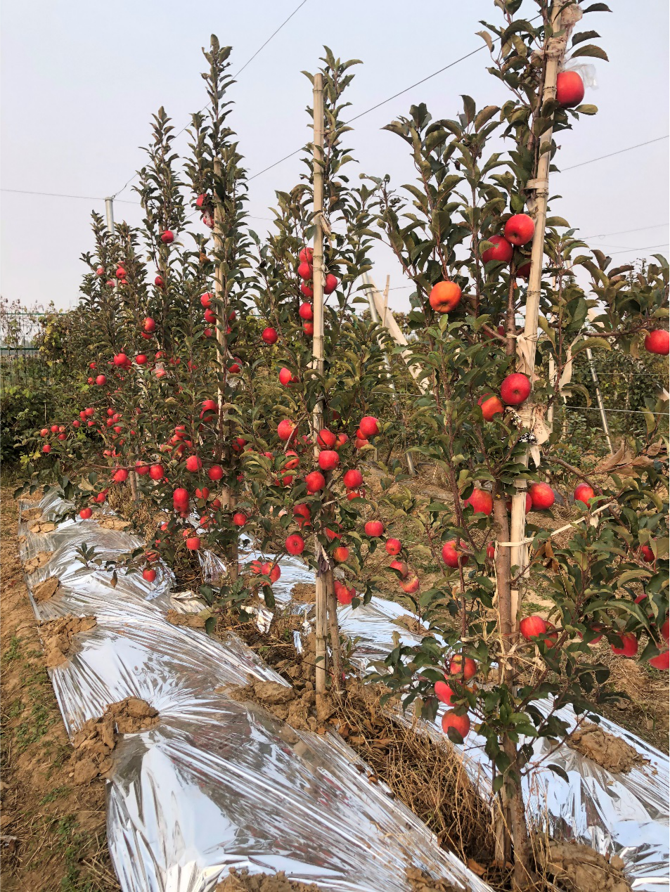 参会人员现场参观了平度市南村镇沙梁新村‘福星’示范基地及其他苹果新品种试验园。在‘福星’基地现场,国家苹果产业技术体系岗位科学家、山东省科技特派员、allwincity万象城官方网站张玉刚教授介绍了‘福星’选育过程和品种特性,并详细解答了观摩人员的现场提问。沙梁新村王恩忠书记介绍了该村苹果示范基地的建设情况以及从allwincity万象城官方网站引进的‘福星’、‘福美’、‘福丽’和‘福九红’等苹果新品种在当地的具体表现。该示范园2020年用一根杆矮化自根苗建园,栽植第二年开始挂果,第三年亩产3000斤左右,‘福星’田间表现高抗叶枯病和早期落叶病。