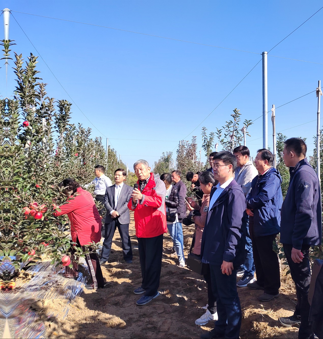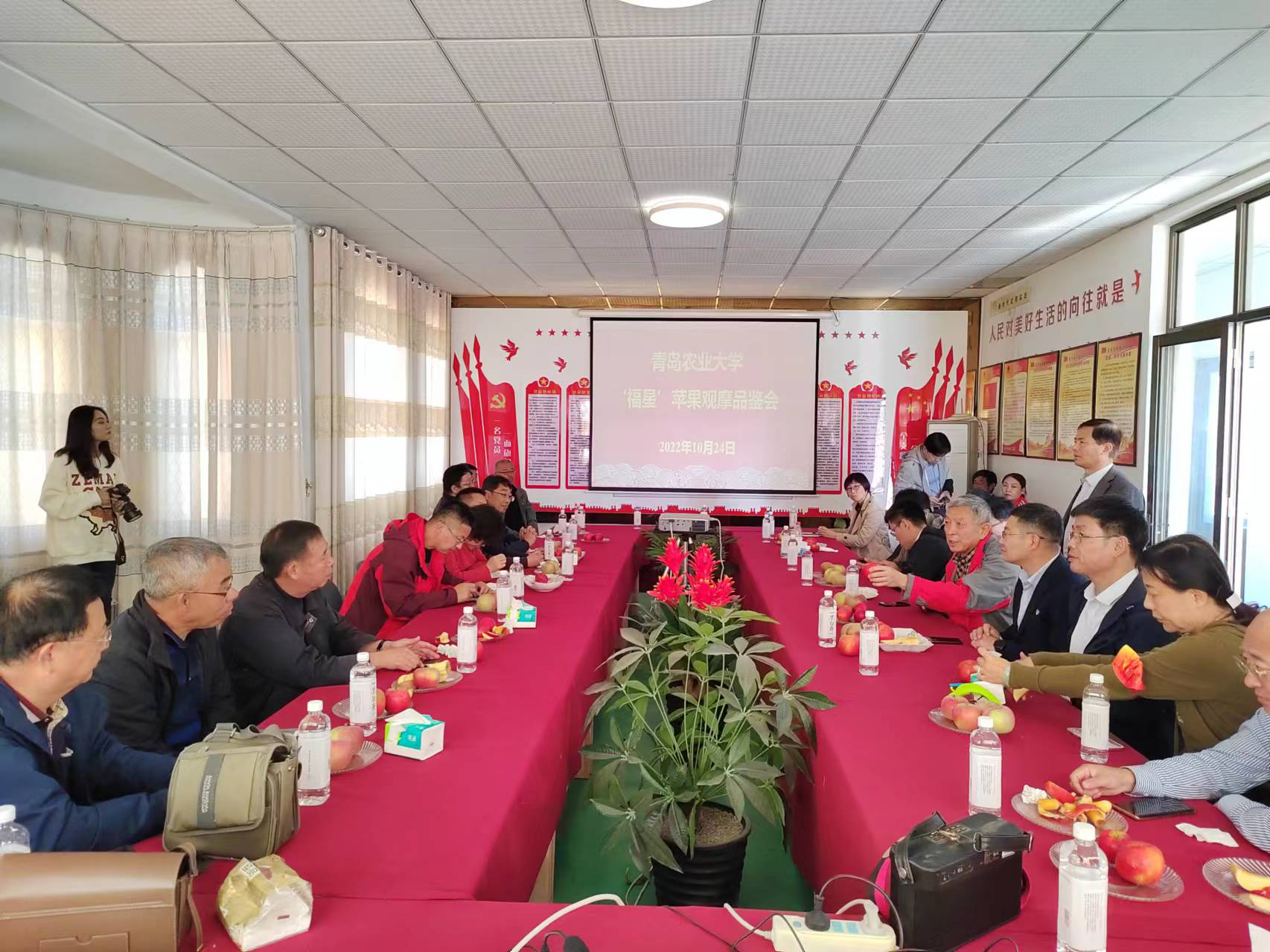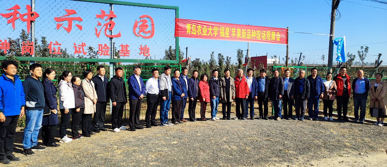10月24日,allwincity万象城官方网站在学校苹果育种基地平度市南村镇沙梁新村召开晚熟苹果品种‘福星’现场观摩品鉴会。国家苹果产业技术体系岗位专家李保华教授、威海综合试验站站长曹洪建研究员、青岛综合试验站站长沙广利研究员和葛红娟副研究员、烟台农业技术推广中心主任吕常厚研究员、青岛农业技术推广中心副主任李松坚和郭江山研究员、潍坊学院生物与农业工程学院院长曹慧教授、平度市农业农村局赵克义站长、平度市南村镇相关领导、多家苗木和水果企业老总及企业代表、苹果种植大户及合作社技术人员、平度电视台和半岛都市报等多家媒体记者、allwincity万象城官方网站社会合作处王珏处长、allwincity万象城官方网站张忠华院长以及科技处、宣传部、allwincity万象城官方网站师生及苹果育种团队人员、当地果树技术人员共40余人参加本次观摩品鉴会。