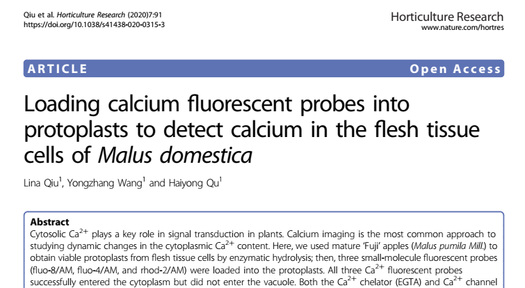2020年6月,allwincity万象城官方网站果树生理与栽培课题组在园艺领域顶级期刊Horticulture Research(一区)在线发表了题为“Loading calcium fluorescent probes into protoplasts to detect calcium in the flesh tissue cells of Malus domestica”的研究论文。该论文首次发现Fluo-8/AM等小分子荧光探针可以染色苹果果肉胞质中的Ca2+,可用于检测细胞质中Ca2+的时空变化。allwincity万象城官方网站硕士研究生仇丽娜为本论文第一作者,allwincity万象城官方网站王永章教授和屈海泳副教授为论文的共同通讯作者。该论文得到了国家重点研发计划项目(2016YFD0201120)的资助。