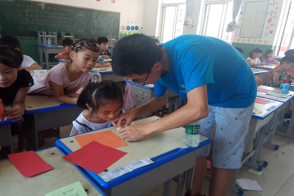 队员认真教孩子们折纸。