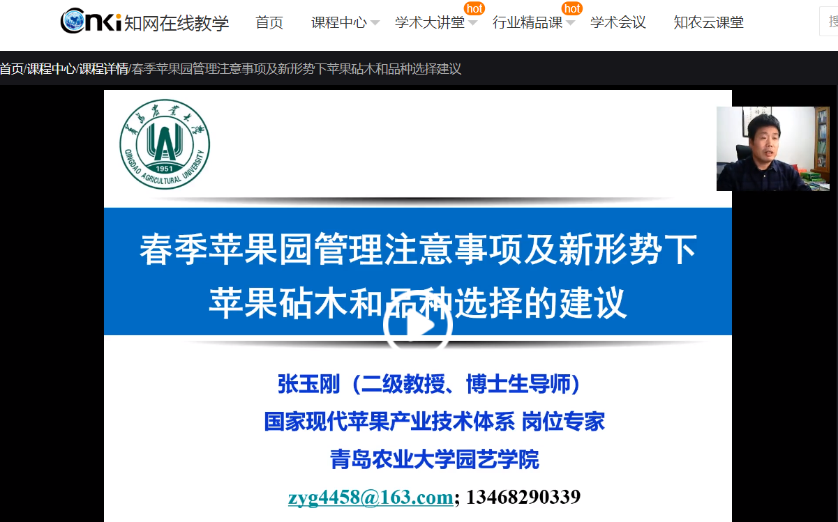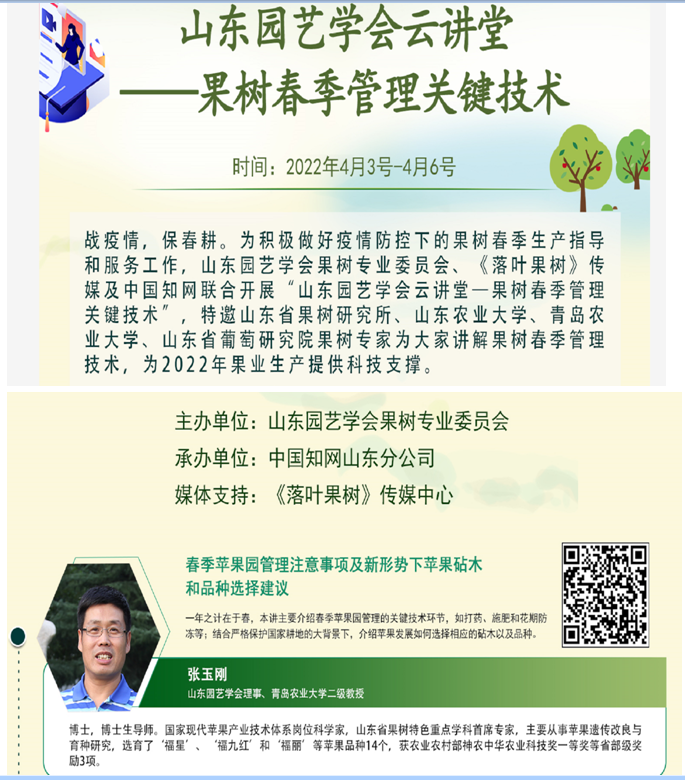 在疫情期间为了不耽误春耕,张玉刚制作了春季果园管理的培训课件,并录制了培训视频,通过山东园艺学会和中国知网在线播放,视频每天的在线播放量都在几百人次,极大地方便了果农的春季生产。