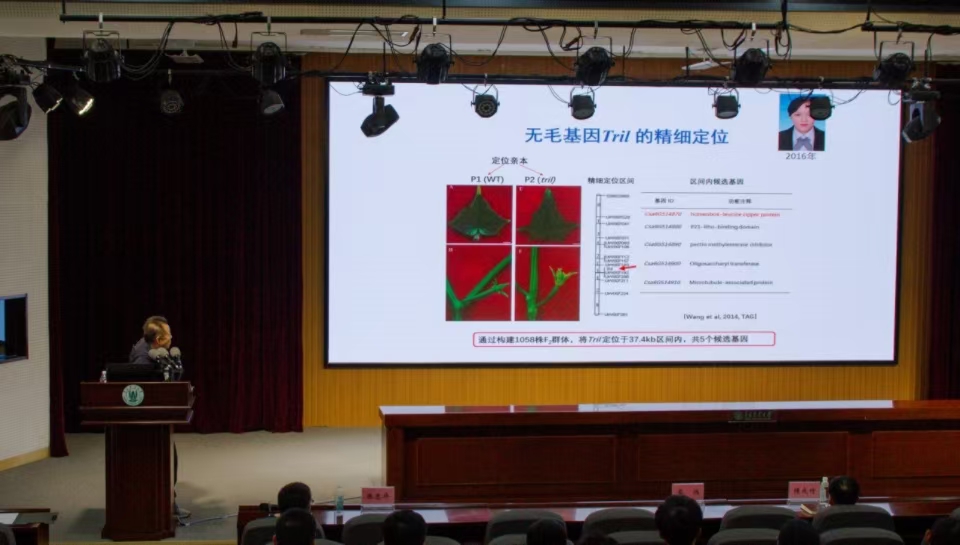 蔡润教授向大家做了题为“黄瓜分子育种技术研究与应用”的报告,分享了自己研究黄瓜的初衷,从遗传多样性鉴定与QTL分析、重要农艺性状基因图位克隆与功能分析、基于Tnt1转座子的新一代遗传变异创制技术、基优异基因的应用与新品种选育四个方面做了精彩的报告。
