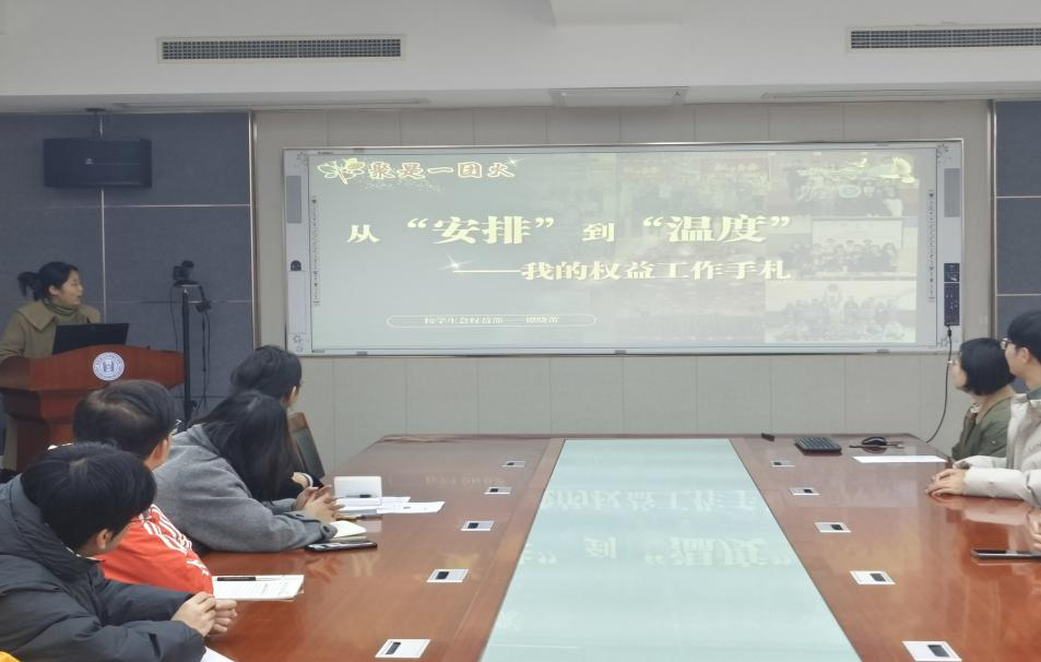 谭晓蕾以《从“安排”到“温度”:我的权益工作手札》为题,从三个方面分享了权益部工作的实践经验与成长感悟。一是介绍在日常工作中,如何将工作制度与人文关怀有效结合;二是介绍“工作台账”制度,明确任务责任、跟踪进度;三是分享心得体会,建议学生干部要学会从“自我中心”转向“全局视角”、从“被动接受”迈向“主动思考”,展现学生干部以温度传递力量、用服务凝聚青年的责任担当与人文情怀。