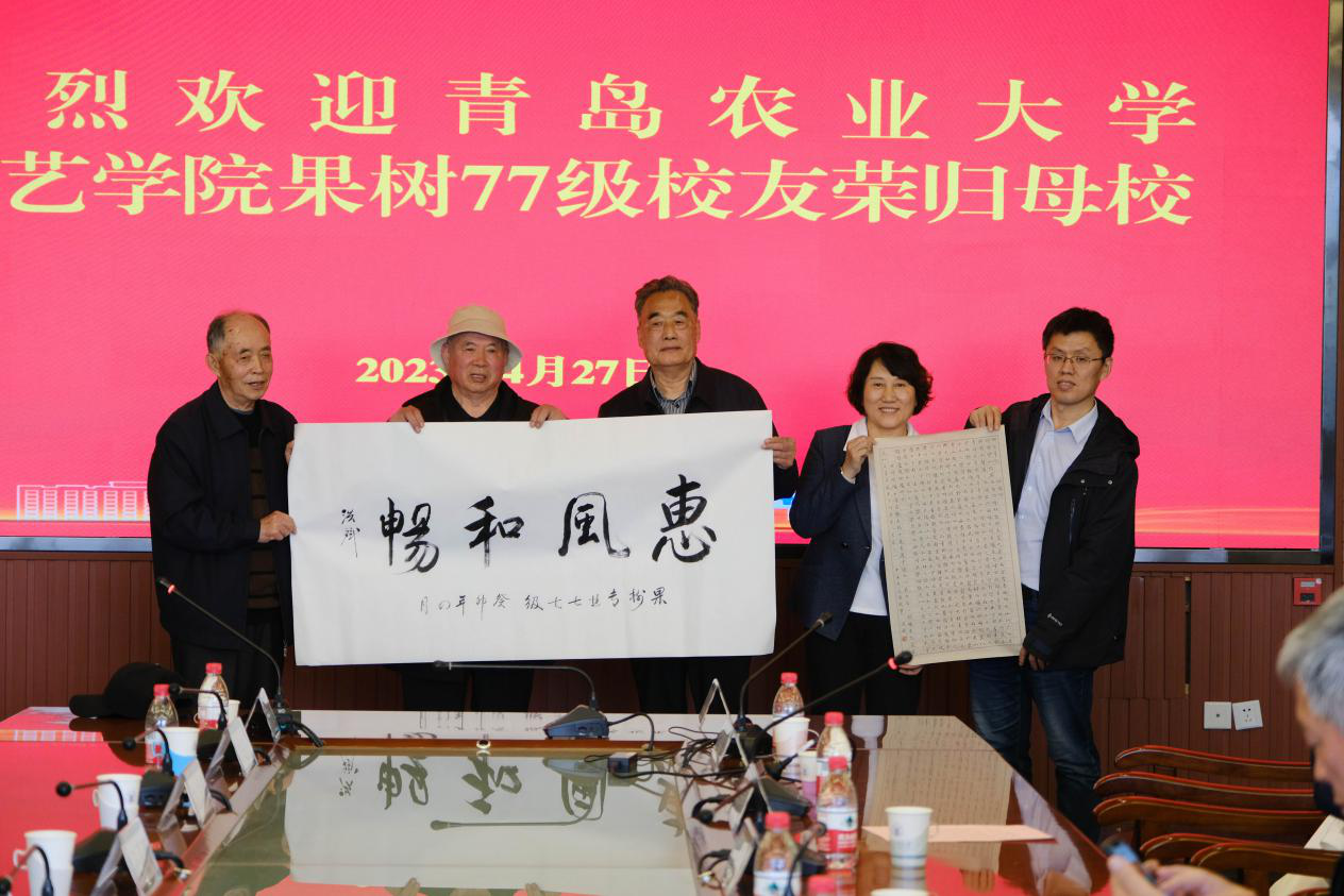 随后,多名校友积极交流发言,感谢学校的精心培养,感慨学校和学院取得的优异成绩,对历代园艺人团结奋进、积极进取的精神表示肯定,并真心祝福学校和学院今后的发展越来越好。王洪斌校友代表77级果树专业校友向学校和学院赠送了书法作品。