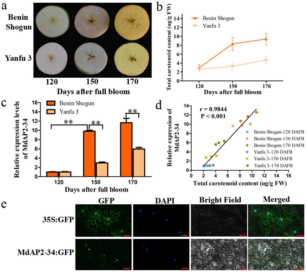 该研究通过对‘早生富士’(Beni Shogun) 和‘烟富3’(Yanfu3) 苹果3个不同发育时期的果实qRT-PCR分析,筛选出了与类胡萝卜素含量显著关联的转录调控因子MdAP2-34。‘早生富士’和‘烟富3’均是红富士苹果的芽变,成熟期‘早生富士’果肉呈黄橙色,类胡萝卜素含量显著高于‘烟富3’(图1)。
