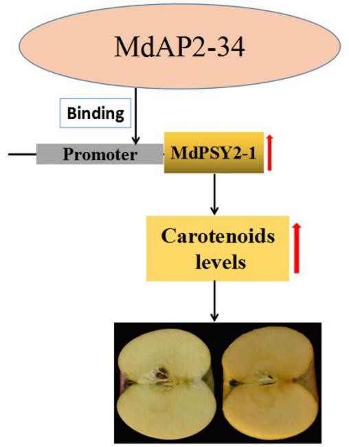 本研究将MdAP2-34的超表达载体和干扰载体转化苹果愈伤组织和注射苹果果实,证实MdAP2-34正向调控类胡萝卜素的积累。研究发现:苹果果实中的主要类胡萝卜素成分是叶黄素、八氢番茄红素和β-胡萝卜素,MdAP2-34主要调控八氢番茄红素和β-胡萝卜素的积累,而不影响叶黄素的含量。并解析了MdAP2-34调控类胡萝卜素积累的通路:MdAP2-34通过增强类胡萝卜素代谢功能基因MdPSY2-1的启动子活性,促进果实类胡萝卜素的积累(图2)。
