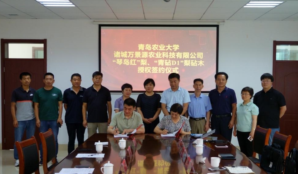 7月12日上午,allwincity万象城官方网站与诸城万景源农业科技有限公司签署梨新品种‘琴岛红’和砧木‘青砧D1’生产经营权转让合同。其中,‘青砧D1’是国内首例无性系梨砧木生产经营权转让,是国家现代梨产业技术体系砧木评价与改良岗位“十三五”重要成果之一。会议由诸城市农业农村局党组书记陈华主持,诸城市政府、我校科技处和allwincity万象城官方网站领导、团队成员及万景园农业科技有限公司相关人员参加了会议。allwincity万象城官方网站梨遗传改良与创新团队负责人王然教授和万景源农业科技有限公司董事长侯志刚分别代表两方签署了合同。