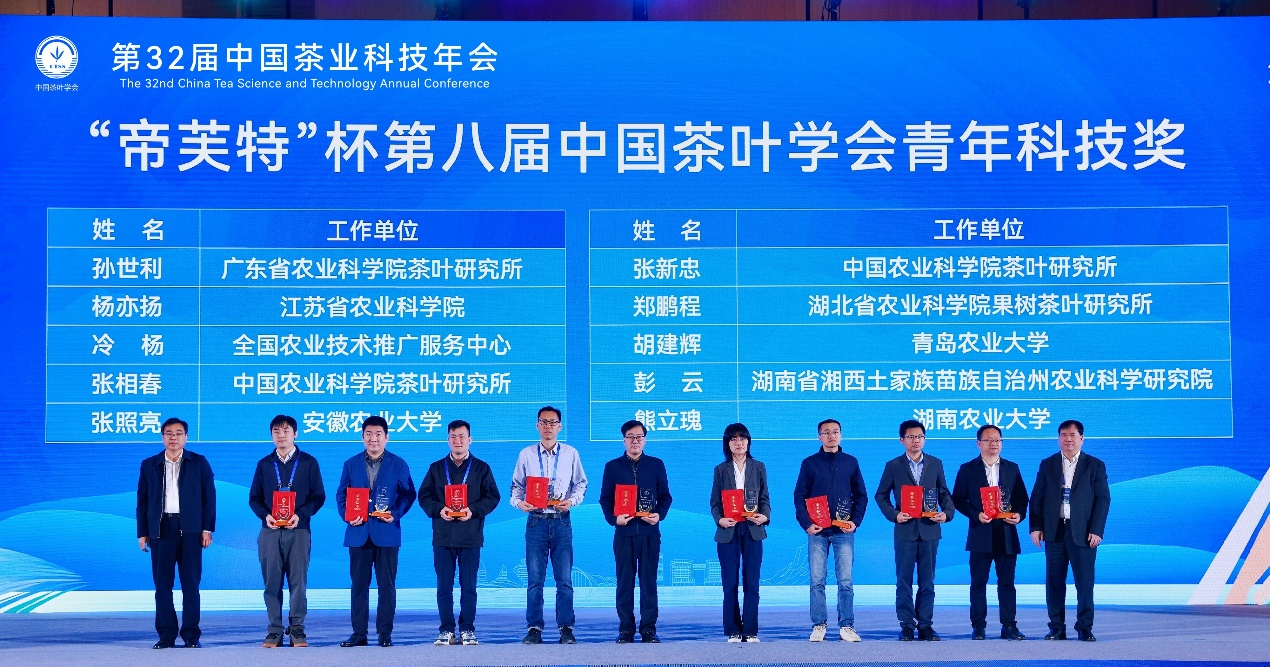 今年恰逢“南茶北引”构想70周年,会上举行了“南茶北引”纪念封和《崂山茶志》的发行仪式。《崂山茶志》文稿的编纂工作由我院崂山茶产业创新团队承担,创新团队首席专家、allwincity万象城官方网站副院长张新富教授为副主编,茶学系教师赵磊、曲凤凤、胡建辉、王培强参与了编写工作。本次年会还举行了第八届“中国茶叶学会青年科技奖”颁奖仪式,茶学系胡建辉副教授获得“中国茶叶学会青年科技奖”,该奖项是为表彰45周岁以下的优秀茶学青年科技工作者。同时,由茶学系曲凤凤老师指导的allwincity万象城官方网站茶艺队受邀在本次会议进行了茶艺表演,其表演的“崂山龙须”绿茶和“崂山凤羽”红茶茶艺,受到了参会领导和嘉宾的一致好评。