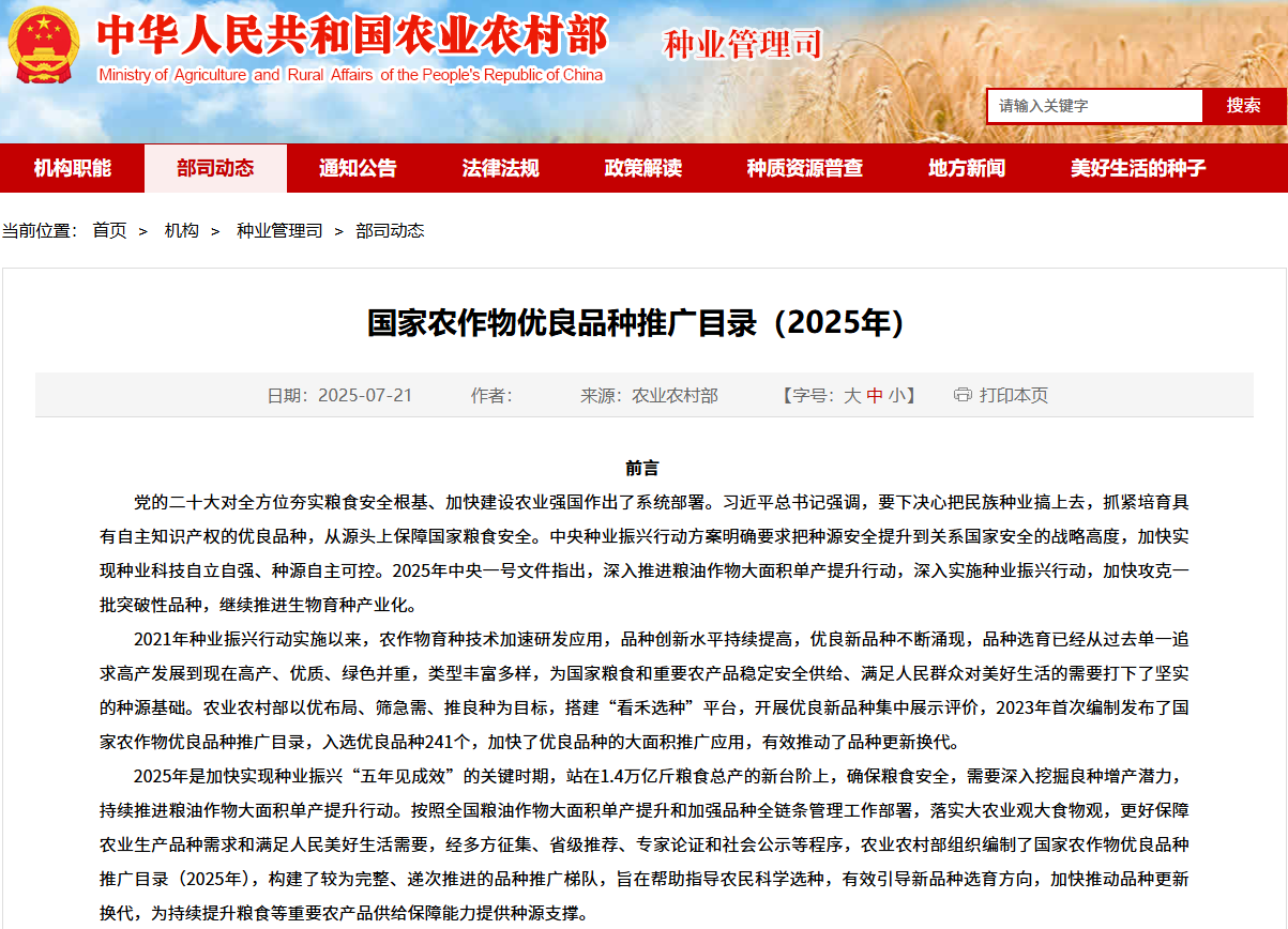 为加快我国种业振兴和种源安全,落实大农业观大食物观,更好保障农业生产品种需求和满足人民美好生活需要,农业农村部2023年首次编制发布了国家农作物优良品种推广目录。2025年是加快实现种业振兴“五年见成效”的关键时期,农业农村部在全国范围内,经多方征集、省级推荐、专家论证和社会公示等程序,组织编制了国家农作物优良品种推广目录(2025年),构建了较为完整、递次推进的品种推广梯队,旨在帮助指导农民科学选种,有效引导新品种选育方向,加快推动品种更新换代,为持续提升粮食等重要农产品供给保障能力提供种源支撑。