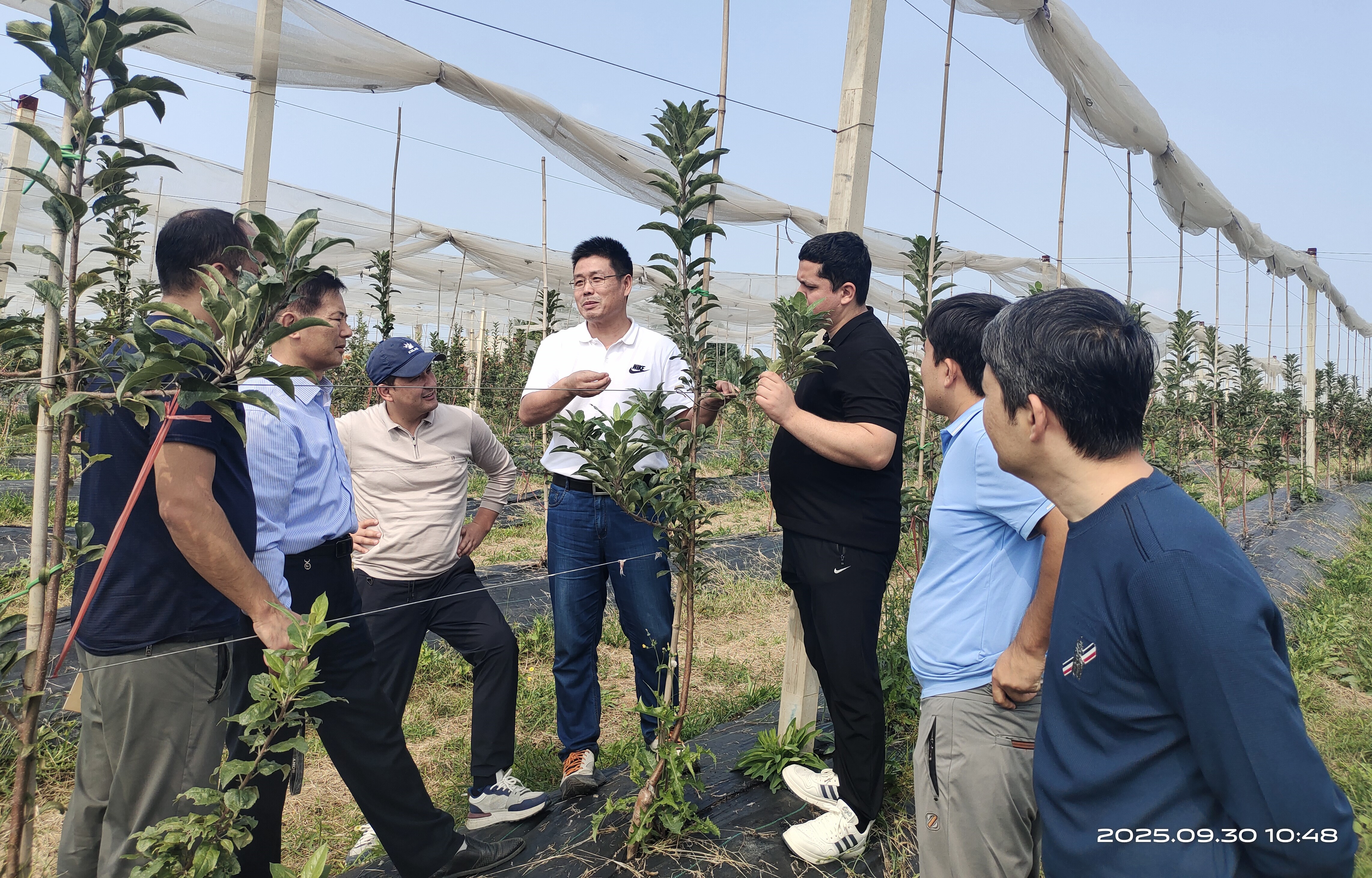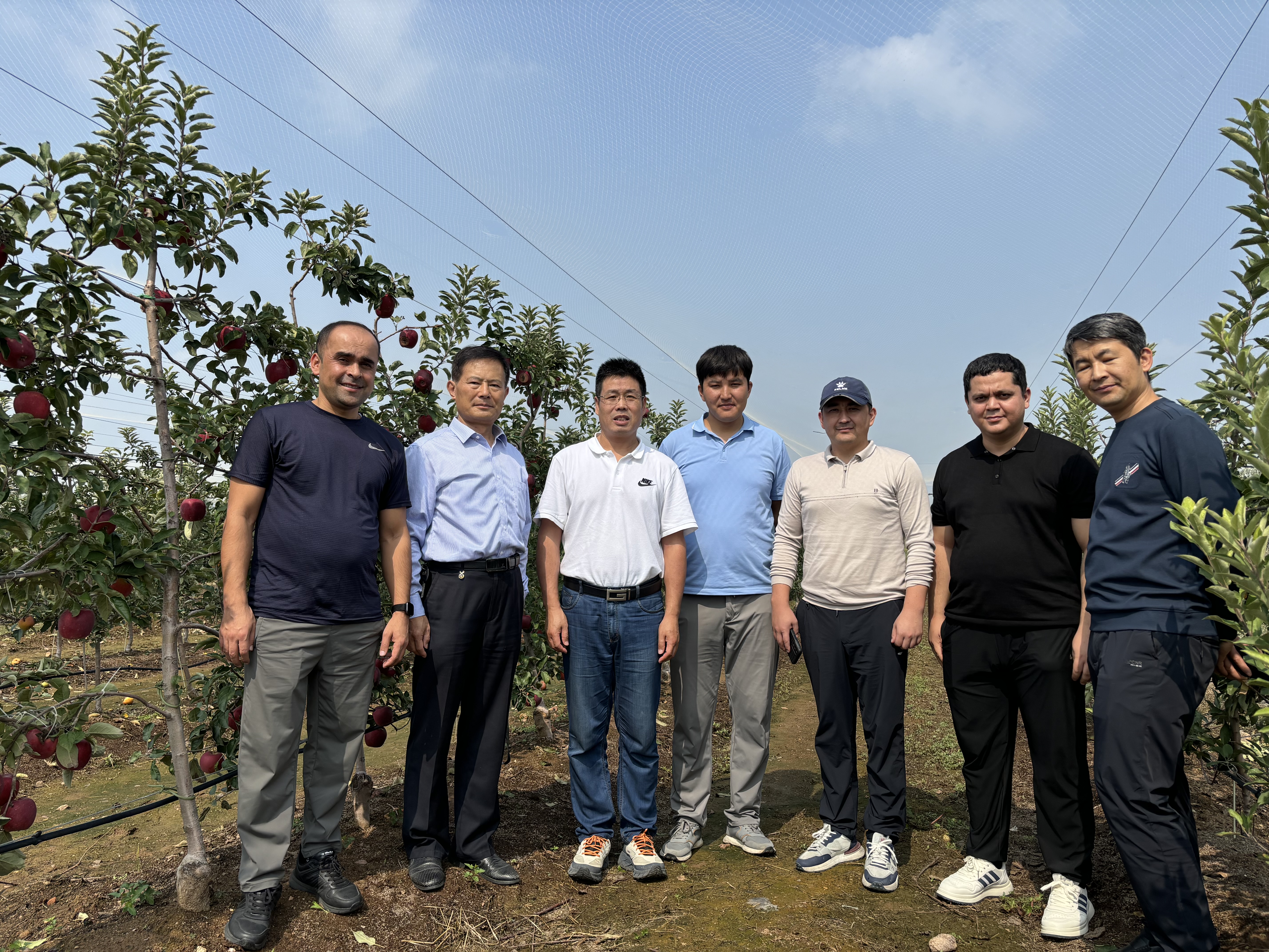 2025年9月30日,来自乌兹别克斯坦科学院遗传学与植物实验生物学研究所的5名访问学者,在国家苹果产业技术体系岗位科学家、苹果育种团队负责人张玉刚教授与祝军教授的陪同下,赴山东诸城苹果产区进行实地考察与交流。