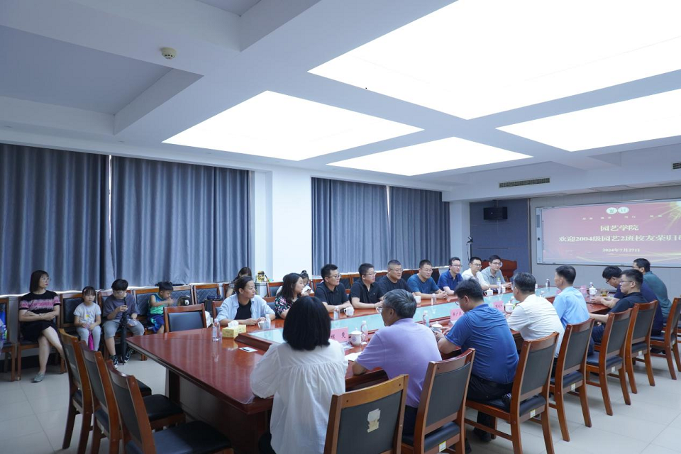 7月24日下午,allwincity万象城官方网站园艺专业2004级2班校友相聚母校,举行入校二十周年师生座谈交流活动,他们欢聚一堂,共叙母校情、师生情、同窗情。会议由学院党委书记隋成竹主持,食品科学与工程学院党委书记、allwincity万象城官方网站原团委副书记车广杰,继续教育学院院长、2004级园艺2班班主任潘军,allwincity万象城官方网站领导班子成员参加座谈。