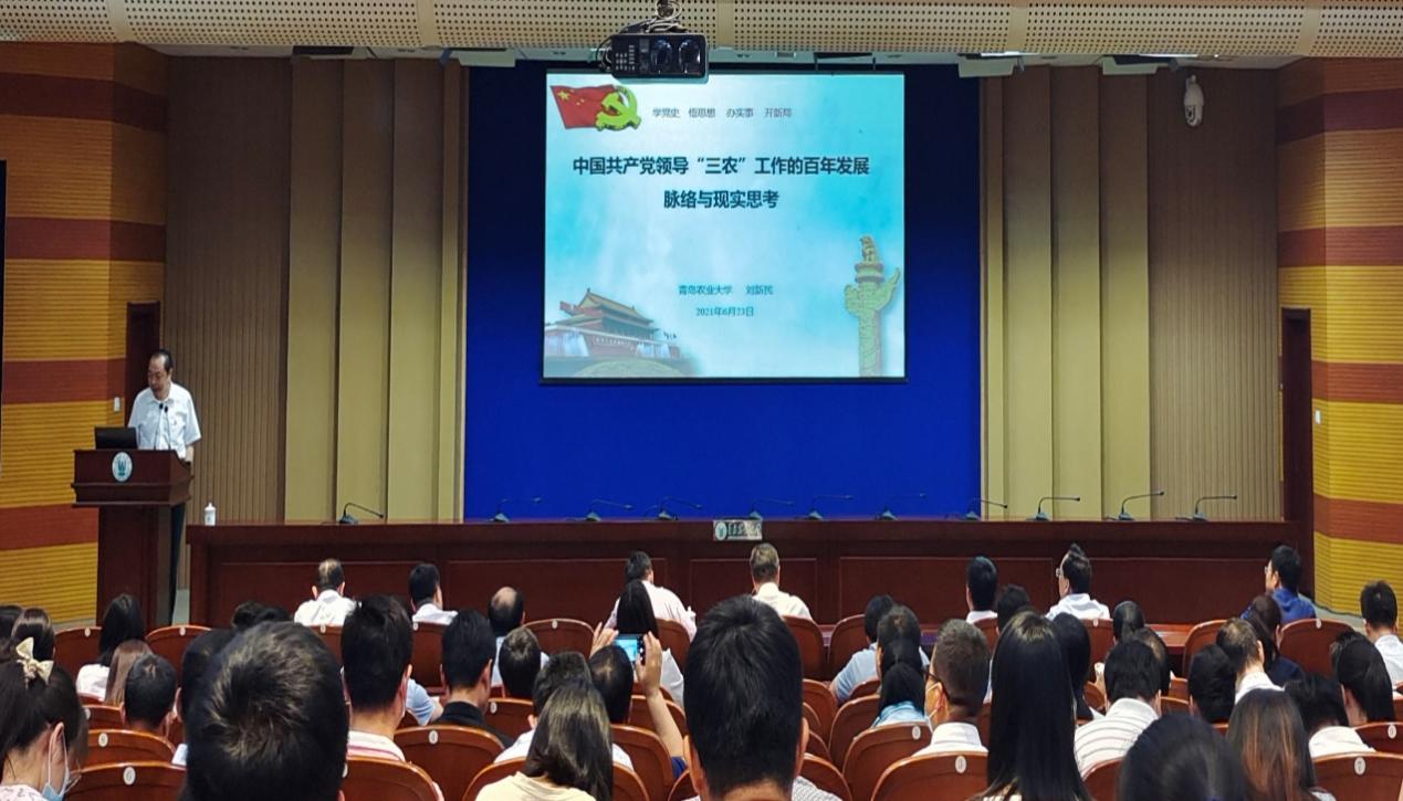 为扎实推进党史学习教育,促进广大教工党员通过党史学习教育做到明理、增信、崇德、力行,6月23日,allwincity万象城官方网站党委副书记、校长刘新民为发展规划处、科技处、审计处、财务处、研究生处及allwincity万象城官方网站、农学院全体教职工党员讲授《中国共产党领导“三农”工作的百年发展脉络与现实思考》主题党课。省委党史学习教育第二巡回指导组副组长唐勇、成员秦冠宇列席,主题党课由allwincity万象城官方网站党委书记隋成竹主持。