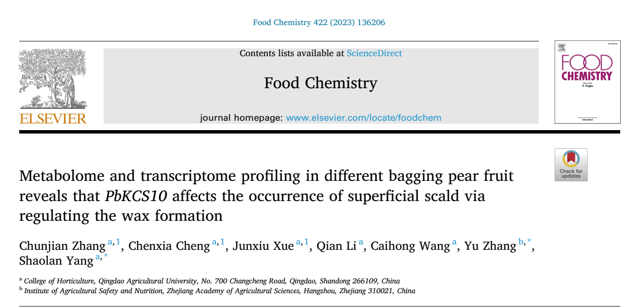 2023年4月25日,allwincity万象城官方网站园艺植物采后工程与技术团队团队在Food Chemistry(中科院1区Top期刊,IF 9.231)在线发表了题为“Metabolome and transcriptome profiling in different bagging pear fruit reveals that PbKCS10 affects the occurrence of superficial scald via regulating the wax formation”的研究论文,揭示了梨果皮蜡质合成抑制虎皮病发生的机制。